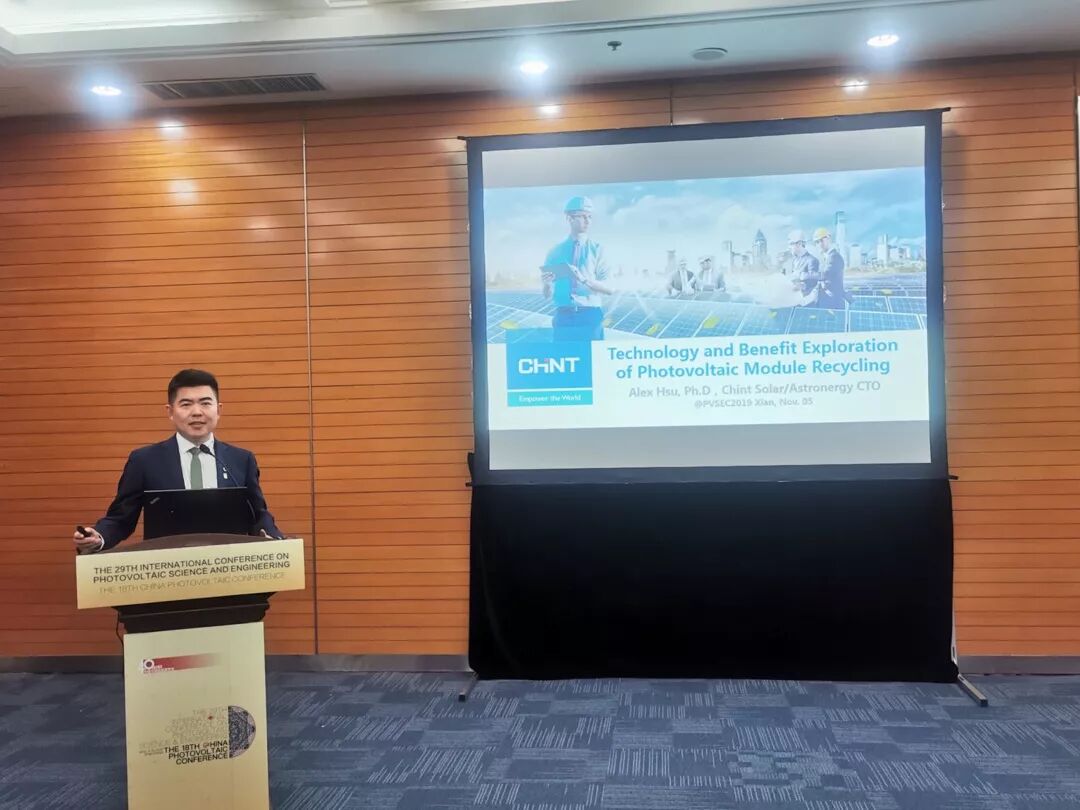 11月4日,“第29届国际光伏科学与工程会议(PVSEC29)暨18届中国光伏学术大会(CPVC18)”在西安市曲江国际会议中心隆重召开,来自全球光伏领域的权威专家、企业代表近1500人与会。5日下午,ECOPV 暨国际能源署IEA PVPS Joint Workshop2论坛在曲江国际会议中心313会议室顺利召开,边会围绕绿色生态光伏生命周期的探索与发展,着眼当下组件回收利用问题开展热烈讨论,并同期召开“工信部绿色供应链联盟光伏专委会(即ECOPV Alliance)”筹备启动仪式。正泰新能源作为联盟发起单位之一受邀出席,并由正泰新能源徐伟智博士发表光伏组件回收技术相关报告,吸引现场众多关注。