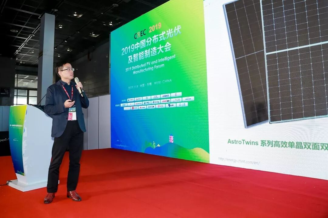 11月8日,“2019中国分布式光伏及智能制造大会”在无锡太湖国际博览中心一楼A3馆隆重召开。作为第十一届中国(无锡)国际新能源大会暨展览会(CREC2019)系列主题活动之一,全球多国来宾、国内城市团组、行业商协会机构、媒体以及企业代表汇聚一堂,围绕前端产品选型和政策解读,共同探索未来商业模式和应用模式。正泰新能源市场部总监王荃、产品管理经理张海涛受邀出席,并由张海涛经理分享正泰新能源智能制造与双面高效组件技术方面经验与实践,助力分布式光伏发展。