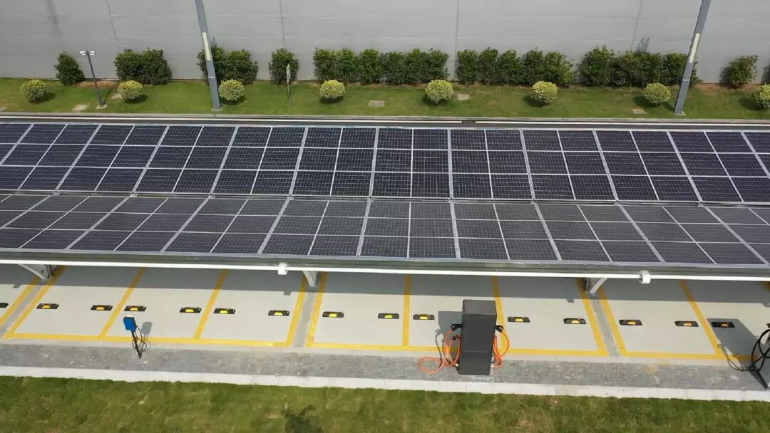 占地面积约330平方米,棚顶采用BIPV设计,由156块405Wp的PERC双面多主栅半片单晶组件组成。车棚 “Y”字造型,含南北两种坡向,坡度为10°,组件沿车棚固有角度平铺安装,两个方向的组件分别通过一个直流汇流箱接入能量路由器的DCDC端口处。车棚中配备一套60kW-V2G直流对充充电桩系统,将光伏、储能与充电桩通过直流母线方式连接,直接将车棚发出的电能充入电动汽车中,最大化新能源利用。